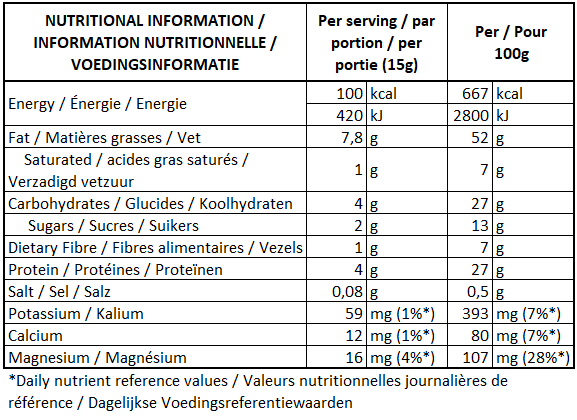 Ingredients Roasted sunflower seeds, Pea protein (16%), Cane sugar, Canola oil (8%), Dry roasted almonds (4%), Cocoa powder (4%), Medium chain triglycerides (MCT) coconut oil (2%), Flax seeds, Himalayan pink salt. May contain: Tree nuts, Peanuts, Sesame.